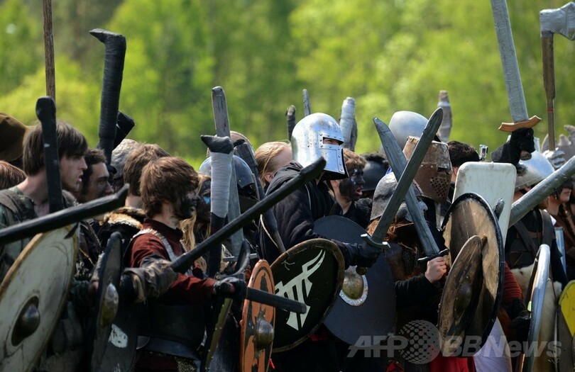 【5月26日 AFP】チェコ北部ドクシ(Doksy)村近くの森で25日、1937年に発表された英国の作家J・R・R・トールキン(J.R.R Tolkien)の不朽の名作小説「ホビットの冒険(The Hobbit)」を再現する毎年恒例のイベントが開催され、登場人物に扮したファン600人以上が集まった。人間とエルフやドワーフ対ゴブリンとアクマイヌの戦闘場面が再現された。(c)AFP