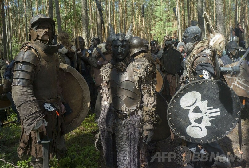 【5月26日 AFP】チェコ北部ドクシ(Doksy)村近くの森で25日、1937年に発表された英国の作家J・R・R・トールキン(J.R.R Tolkien)の不朽の名作小説「ホビットの冒険(The Hobbit)」を再現する毎年恒例のイベントが開催され、登場人物に扮したファン600人以上が集まった。人間とエルフやドワーフ対ゴブリンとアクマイヌの戦闘場面が再現された。(c)AFP