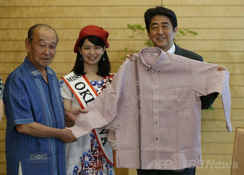 【5月26日 AFP】沖縄県の仲井真弘多(Hirokazu Nakaima)知事は26日、ミス沖縄の名護愛(Chika Nago)さんとともに首相官邸を訪問し、沖縄伝統の夏用シャツ「かりゆしウエア」を安倍晋三(Shinzo Abe)首相に贈呈した。(c)AFP