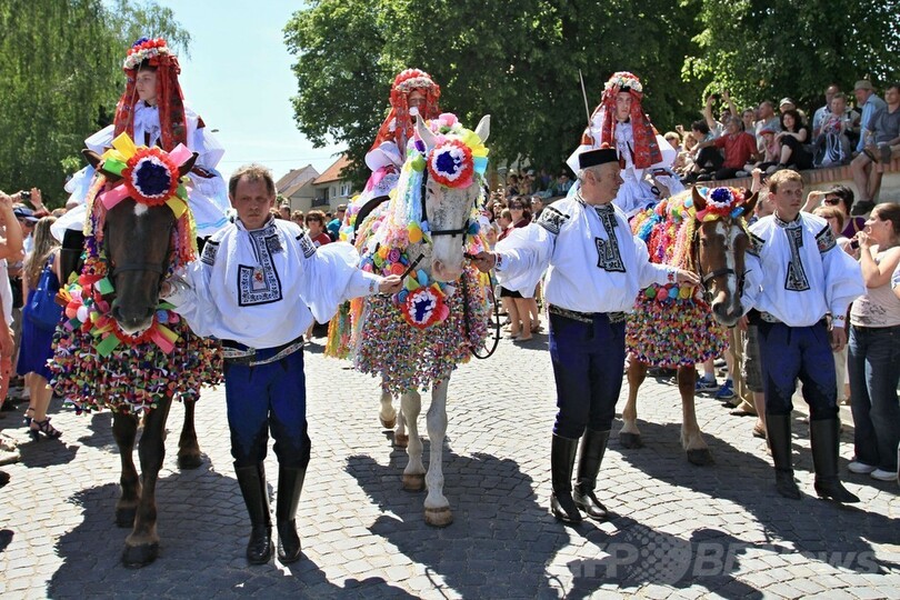 ニュース ライフ モラビア伝統の騎馬行列「王様騎行」 2014年5月26日 17:40 発信地:ブルチノフ/チェコ [ ヨーロッパ チェコ ] このニュースをシェア ‹ › ❮ 15/15 ❯ チェコ・モラビア(Moravia)地方南部のブルチノフ(Vlcnov)で催された伝統行事「王様騎行」で、口にバラをくわえて女装をした王に扮し、騎馬行列を率いる11歳の少年フランティシェック・ソバン(Frantisek Soban)君(中央、2014年5月25日撮影)。(c)AFP/RADEK MICA 画像作成中 ! 【5月26日 AFP】チェコ・モラビア(Moravia)地方南部のブルチノフ(Vlcnov)で25日、同国で最も有名な伝統行事の一つである「王様騎行」が催され、民族衣装で着飾り王侯に扮した華やかな騎馬行列が練り歩いた。(c)AFP ライフ 一覧へ> メディア・報道関係・法人の方向け 写真・動画 購入のお問合せ>