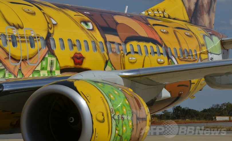 専用機はGOL航空(Gol Transportes Aereos)のボーイング(Boeing)737-800型機で、機体には地元ブラジル出身の双子のグラフィティアーティスト「オス・ジェメオス(Os Gemeos、双子の意)」によるデザインが施されている。(c)AFP