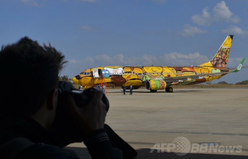 専用機はGOL航空(Gol Transportes Aereos)のボーイング(Boeing)737-800型機で、機体には地元ブラジル出身の双子のグラフィティアーティスト「オス・ジェメオス(Os Gemeos、双子の意)」によるデザインが施されている。(c)AFP
