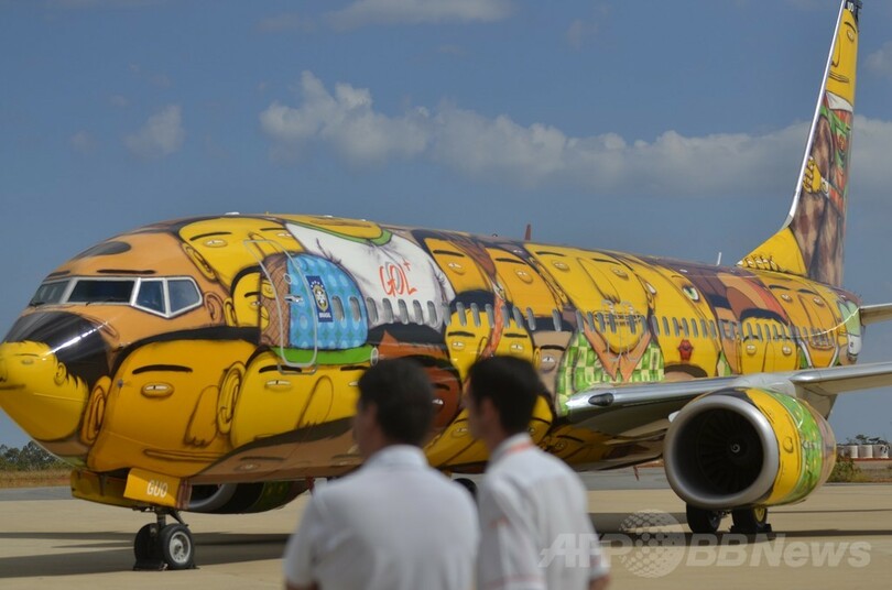 専用機はGOL航空(Gol Transportes Aereos)のボーイング(Boeing)737-800型機で、機体には地元ブラジル出身の双子のグラフィティアーティスト「オス・ジェメオス(Os Gemeos、双子の意)」によるデザインが施されている。(c)AFP