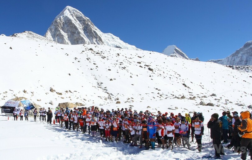 エベレストの標高8848メートルにちなみ、午前8時48分にマラソンはスタート。スタート地点は、標高5364メートルのベースキャンプが10センチほどの積雪に見舞われたため、標高5160メートル地点のゴラクシェプ(Gorak Shep)に変更され、ランナーたちは1600メートル下のナムチェ・バザール(Namche Bazaar)を目指した。