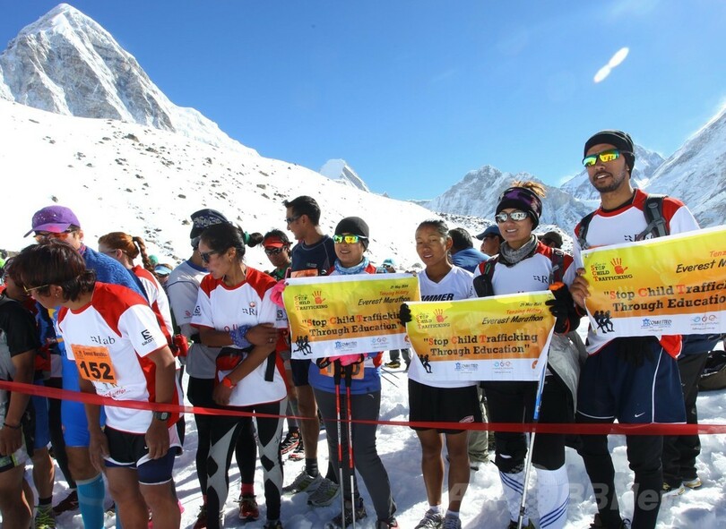 例年はランナーたちと下山する登山客が交錯する光景がみられるが、今年は4月にネパール人ガイド16人が死亡した雪崩の影響でネパール側のルートは事実上、閉山状態となっている。