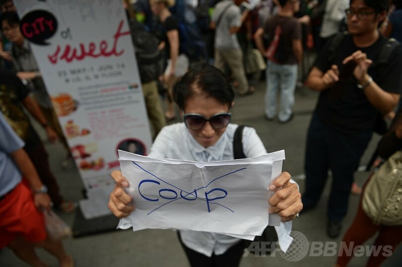 【6月2日 AFP】クーデターで軍事政権が全権を掌握したタイの首都バンコク(Bangkok)では1日、数千人の治安部隊が軍用車両も動員して厳戒態勢を敷く街中のあちこちで、クーデターに反対する人々がソーシャルメディアを活用したゲリラ的な小規模デモを展開した。