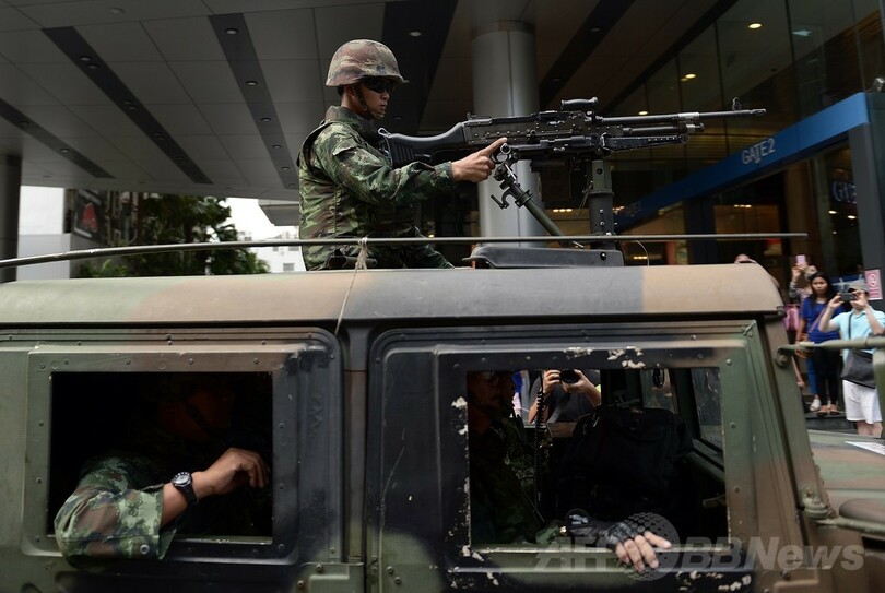 【6月2日 AFP】クーデターで軍事政権が全権を掌握したタイの首都バンコク(Bangkok)では1日、数千人の治安部隊が軍用車両も動員して厳戒態勢を敷く街中のあちこちで、クーデターに反対する人々がソーシャルメディアを活用したゲリラ的な小規模デモを展開した。