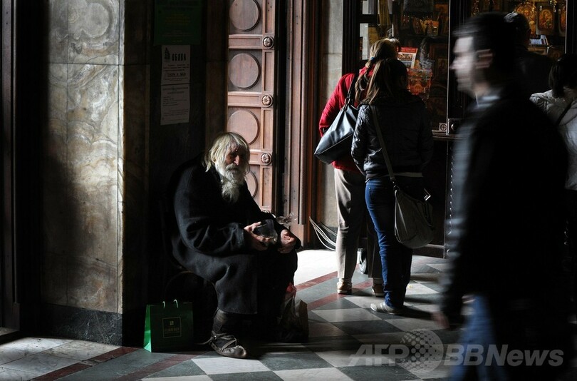 「パンを少しちぎっていってください。神からの贈り物ですから」。ひげが長く伸びたドブリさんは背中を丸めて座り、プラスチックのコップに小銭を入れた人にそうつぶやきながら、別の誰かからもらったパンを差し出し相手の手にキスをする。
