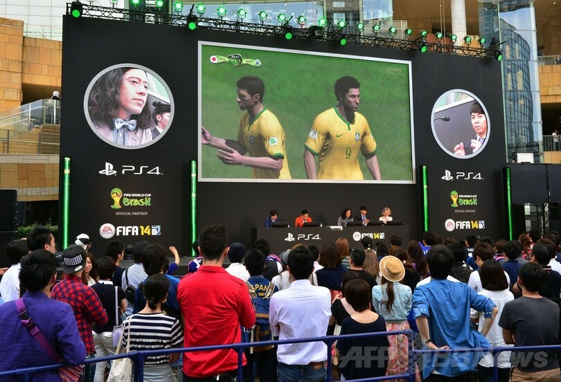 【6月4日 AFP】家庭用ゲーム機「プレイステーション4(PlayStation 4、PS4)」用サッカーゲームで、サッカーW杯ブラジル大会(2014 World Cup)に合わせて数量限定で販売される「FIFA 14 2014 FIFA World Cup Brazil Limited Pack」の発売イベントが4日、都内で行われ、ゲームのシミュレーションではブラジルが優勝した。サッカーW杯ブラジル大会は12日開幕する。(c)AFP