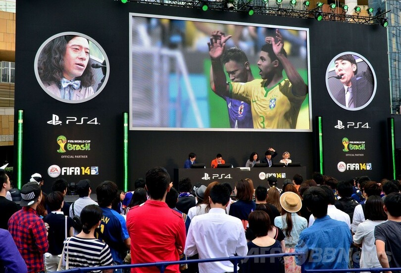 【6月4日 AFP】家庭用ゲーム機「プレイステーション4(PlayStation 4、PS4)」用サッカーゲームで、サッカーW杯ブラジル大会(2014 World Cup)に合わせて数量限定で販売される「FIFA 14 2014 FIFA World Cup Brazil Limited Pack」の発売イベントが4日、都内で行われ、ゲームのシミュレーションではブラジルが優勝した。サッカーW杯ブラジル大会は12日開幕する。(c)AFP