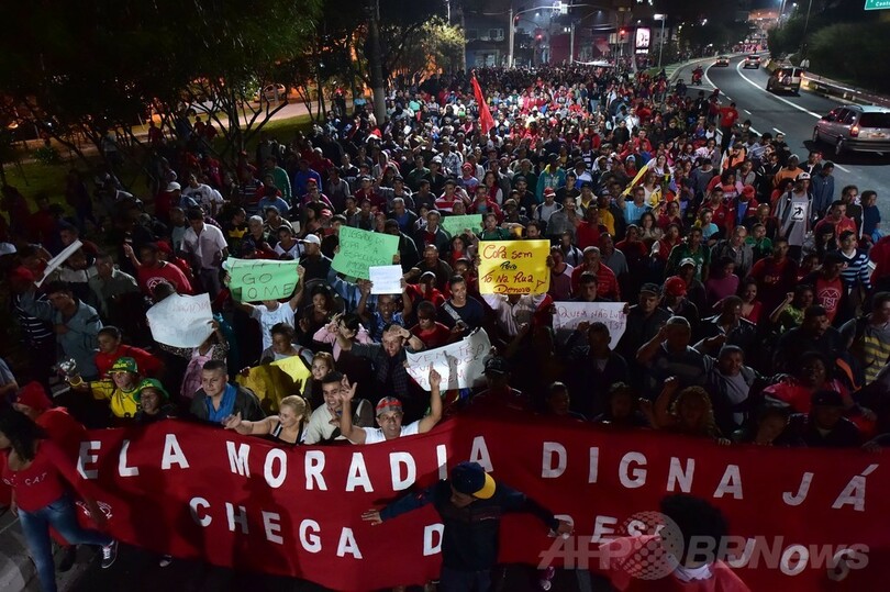 一方、同市内では4日、W杯開催に反対するデモを主導してきた団体の1つ、「ホームレス労働者運動(Movimento dos Trabalhadores Sem Teto、MTST)」が、12日にW杯開幕戦が行われるアレーナ・デ・サンパウロ(Arena de Sao Paulo)周辺でデモ行進を行い、約4000人が参加するなど、W杯開幕を目前に抗議運動の勢いが強まっている。(c)AFP