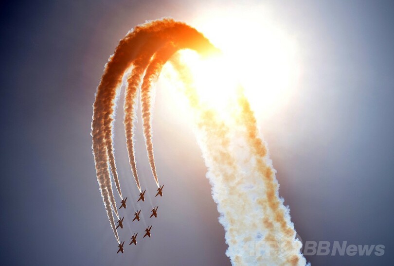 【6月6日 AFP】第2次世界大戦(World War II)のノルマンディー(Normandy)上陸作戦決行日「Dデー(D-Day)」から70年となる記念日を翌日に控えた5日、英南部ポーツマス(Portsmouth)で英空軍(Royal Air Force、RAF)のアクロバット飛行チーム「レッドアローズ(Red Arrows)」によるアクロバット飛行が披露された。