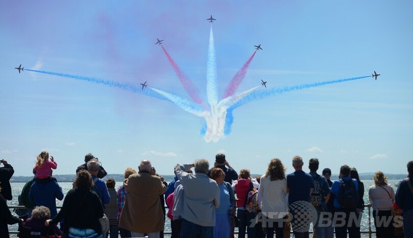 【6月6日 AFP】第2次世界大戦(World War II)のノルマンディー(Normandy)上陸作戦決行日「Dデー(D-Day)」から70年となる記念日を翌日に控えた5日、英南部ポーツマス(Portsmouth)で英空軍(Royal Air Force、RAF)のアクロバット飛行チーム「レッドアローズ(Red Arrows)」によるアクロバット飛行が披露された。