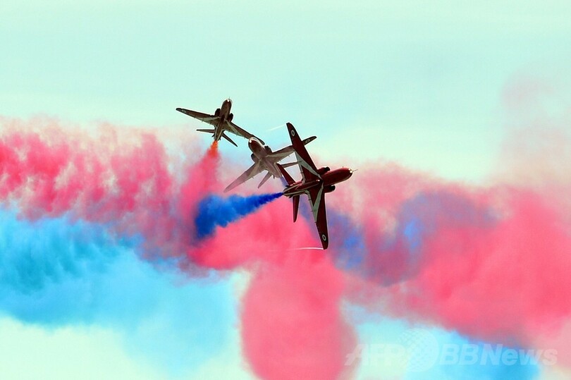【6月6日 AFP】第2次世界大戦(World War II)のノルマンディー(Normandy)上陸作戦決行日「Dデー(D-Day)」から70年となる記念日を翌日に控えた5日、英南部ポーツマス(Portsmouth)で英空軍(Royal Air Force、RAF)のアクロバット飛行チーム「レッドアローズ(Red Arrows)」によるアクロバット飛行が披露された。