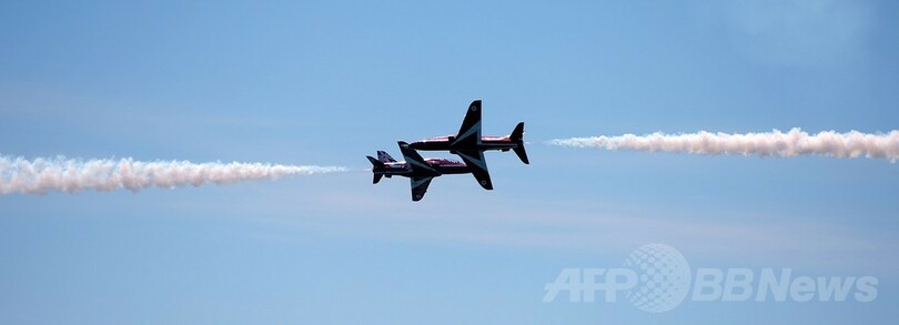 【6月6日 AFP】第2次世界大戦(World War II)のノルマンディー(Normandy)上陸作戦決行日「Dデー(D-Day)」から70年となる記念日を翌日に控えた5日、英南部ポーツマス(Portsmouth)で英空軍(Royal Air Force、RAF)のアクロバット飛行チーム「レッドアローズ(Red Arrows)」によるアクロバット飛行が披露された。