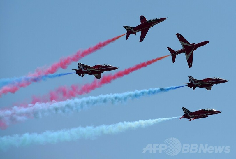 【6月6日 AFP】第2次世界大戦(World War II)のノルマンディー(Normandy)上陸作戦決行日「Dデー(D-Day)」から70年となる記念日を翌日に控えた5日、英南部ポーツマス(Portsmouth)で英空軍(Royal Air Force、RAF)のアクロバット飛行チーム「レッドアローズ(Red Arrows)」によるアクロバット飛行が披露された。