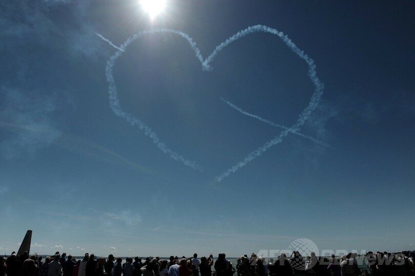 【6月6日 AFP】第2次世界大戦(World War II)のノルマンディー(Normandy)上陸作戦決行日「Dデー(D-Day)」から70年となる記念日を翌日に控えた5日、英南部ポーツマス(Portsmouth)で英空軍(Royal Air Force、RAF)のアクロバット飛行チーム「レッドアローズ(Red Arrows)」によるアクロバット飛行が披露された。