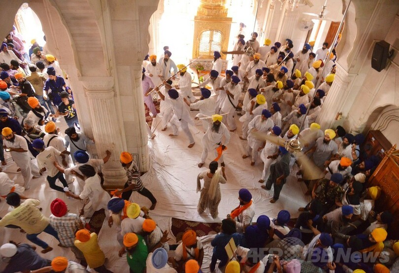 現地のAFPカメラマンによると、衝突で少なくとも2人が負傷したという。テレビが伝えた現地映像には、青色とサフラン色のターバンを巻いた人々の2つのグループが寺院内で、剣を手に互いを追いかけまわしている様子が映し出された。衝突の原因は、片方の集団が最初にマイクで演説をする許可を得たと主張したことだという。