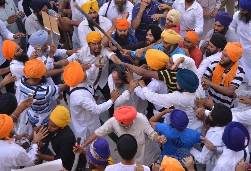 現地のAFPカメラマンによると、衝突で少なくとも2人が負傷したという。テレビが伝えた現地映像には、青色とサフラン色のターバンを巻いた人々の2つのグループが寺院内で、剣を手に互いを追いかけまわしている様子が映し出された。衝突の原因は、片方の集団が最初にマイクで演説をする許可を得たと主張したことだという。