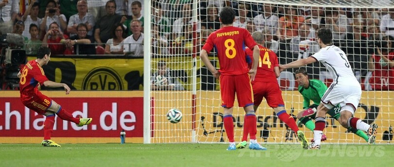 試合は、後半にアンドレ・シュールレ(Andre Schuerrle)のゴールでドイツが先制したものの、ヘンリク・ムヒタリアン(Henrikh Mkhitaryan)のPKでアルメニアが同点に追いついた。それでも、ドイツは試合終了までの約17分間で堰を切ったかのように5得点を挙げた。