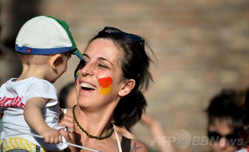 性の多様性への支持を象徴するレインボーフラッグを掲げた人たちや、フランス語で「全ての人に愛を」と書いた法王の帽子をかぶった人の姿も見られ、イニャツィオ・マリーノ(Ignazio Marino)市長も国旗と同じ3色で作ったたすきを掛けて、パレードに参加した。(c)AFP