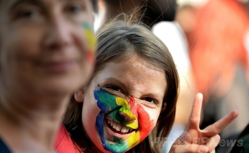 性の多様性への支持を象徴するレインボーフラッグを掲げた人たちや、フランス語で「全ての人に愛を」と書いた法王の帽子をかぶった人の姿も見られ、イニャツィオ・マリーノ(Ignazio Marino)市長も国旗と同じ3色で作ったたすきを掛けて、パレードに参加した。(c)AFP