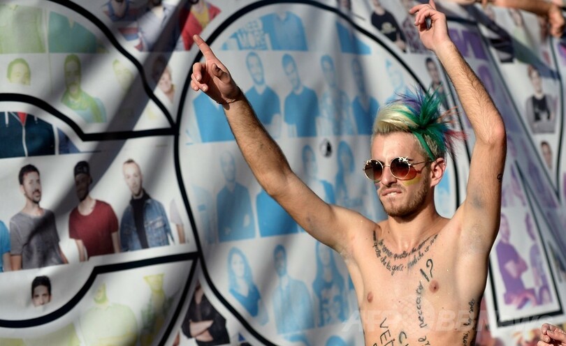 性の多様性への支持を象徴するレインボーフラッグを掲げた人たちや、フランス語で「全ての人に愛を」と書いた法王の帽子をかぶった人の姿も見られ、イニャツィオ・マリーノ(Ignazio Marino)市長も国旗と同じ3色で作ったたすきを掛けて、パレードに参加した。(c)AFP