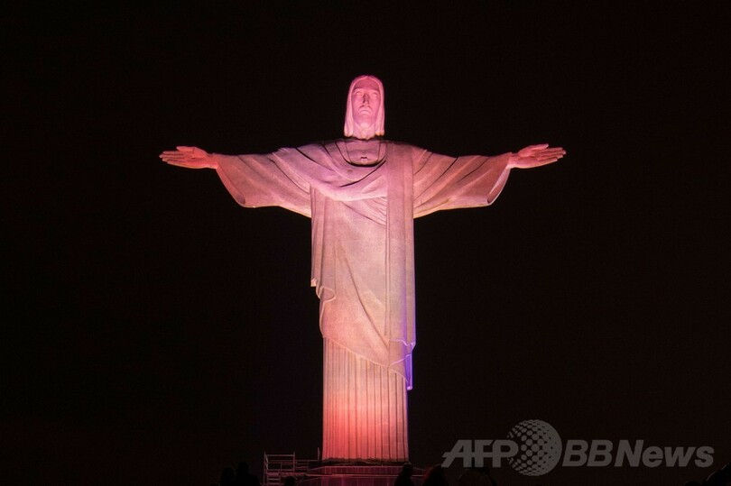 リオのキリスト像が日の丸カラーに、W杯開幕祝う ブラジル