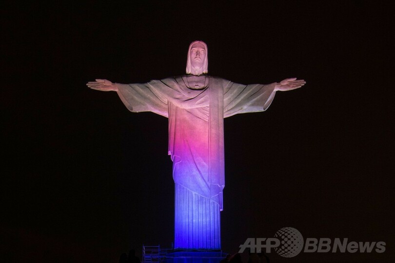 リオのキリスト像が日の丸カラーに、W杯開幕祝う ブラジル