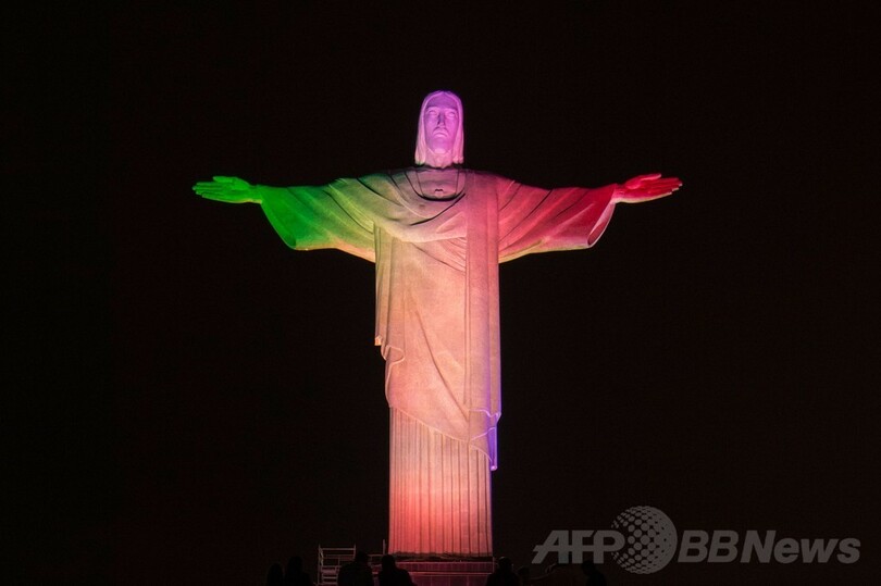 リオのキリスト像が日の丸カラーに、W杯開幕祝う ブラジル