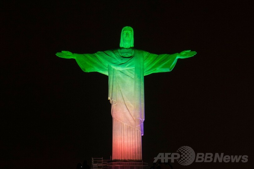 リオのキリスト像が日の丸カラーに、W杯開幕祝う ブラジル