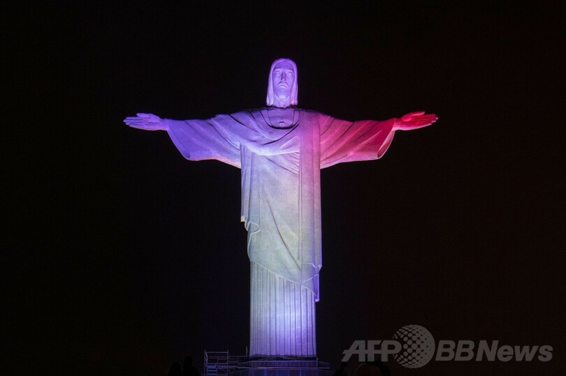 リオのキリスト像が日の丸カラーに、W杯開幕祝う ブラジル