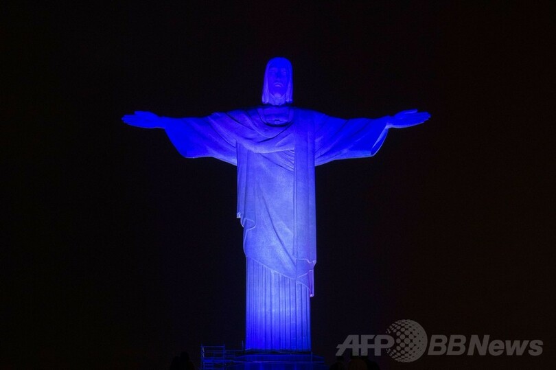 リオのキリスト像が日の丸カラーに、W杯開幕祝う ブラジル