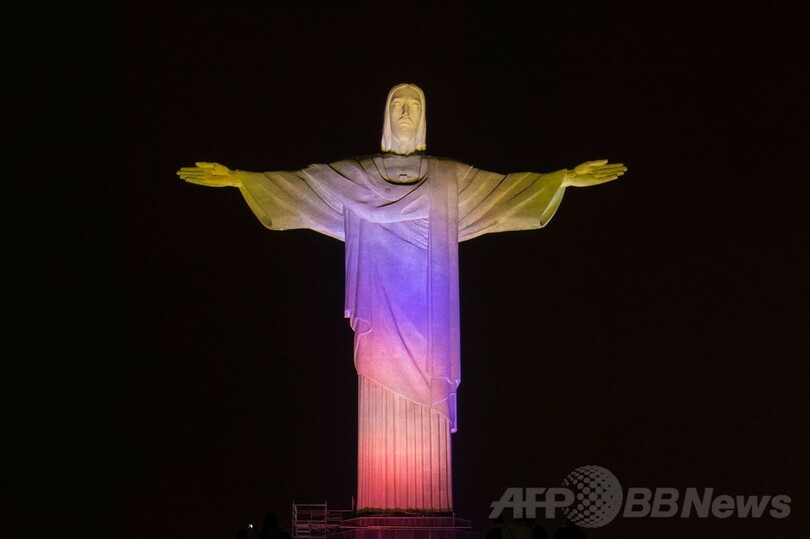 リオのキリスト像が日の丸カラーに、W杯開幕祝う ブラジル