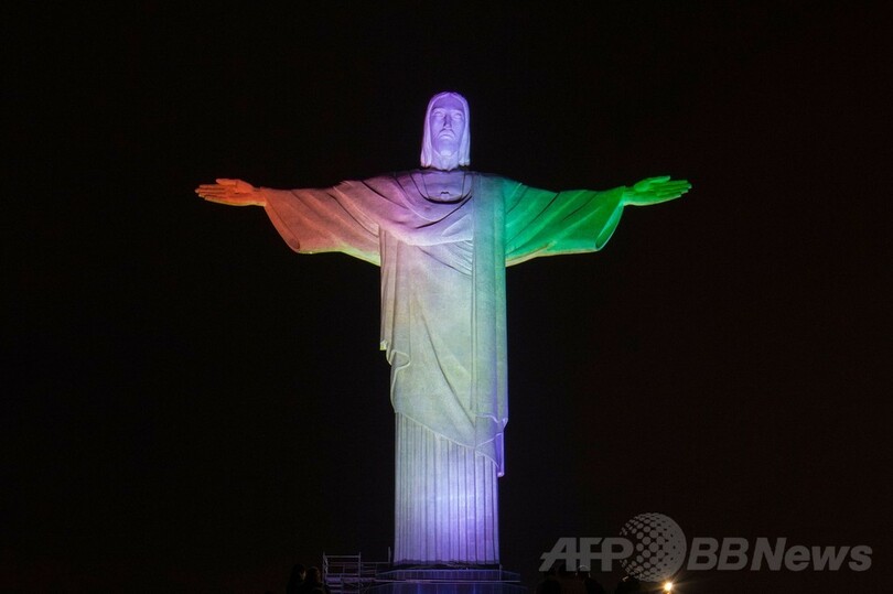 リオのキリスト像が日の丸カラーに、W杯開幕祝う ブラジル