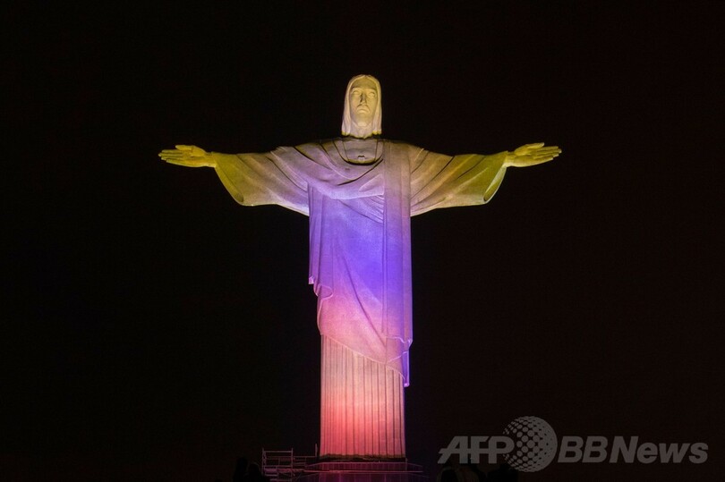 リオのキリスト像が日の丸カラーに、W杯開幕祝う ブラジル