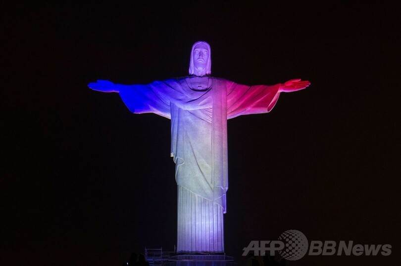リオのキリスト像が日の丸カラーに、W杯開幕祝う ブラジル