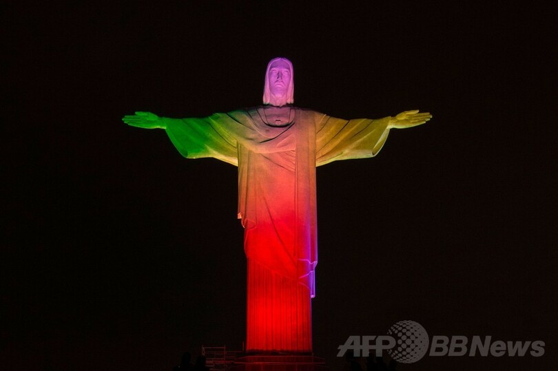 リオのキリスト像が日の丸カラーに、W杯開幕祝う ブラジル