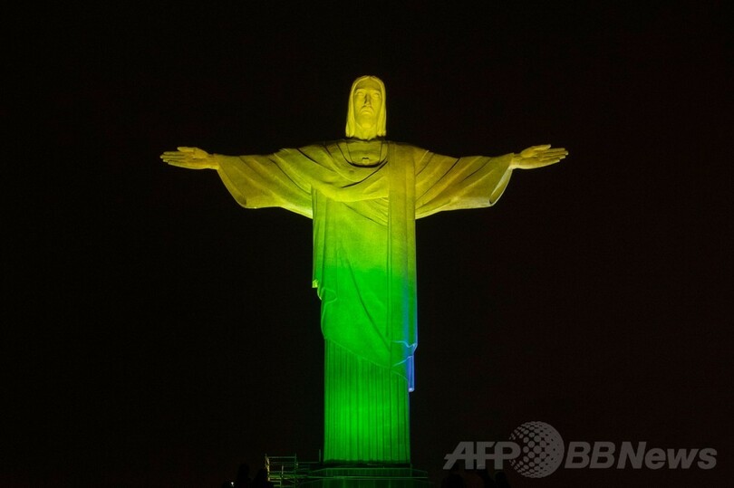 リオのキリスト像が日の丸カラーに、W杯開幕祝う ブラジル