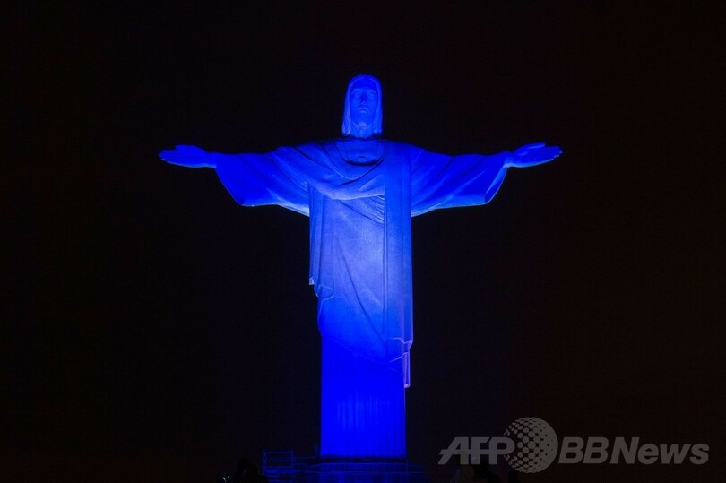 リオのキリスト像が日の丸カラーに、W杯開幕祝う ブラジル