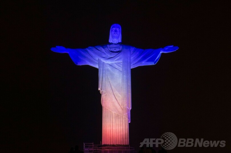 リオのキリスト像が日の丸カラーに、W杯開幕祝う ブラジル