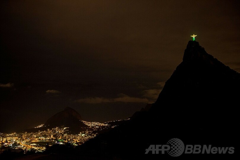 リオのキリスト像が日の丸カラーに、W杯開幕祝う ブラジル