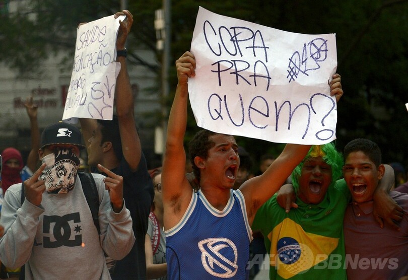 約200人のデモ隊が「W杯を潰せ」などと書かれたプラカードを掲げて大通りを行進、警察当局はトラックやヘリコプター、警官数十人を出動させた。