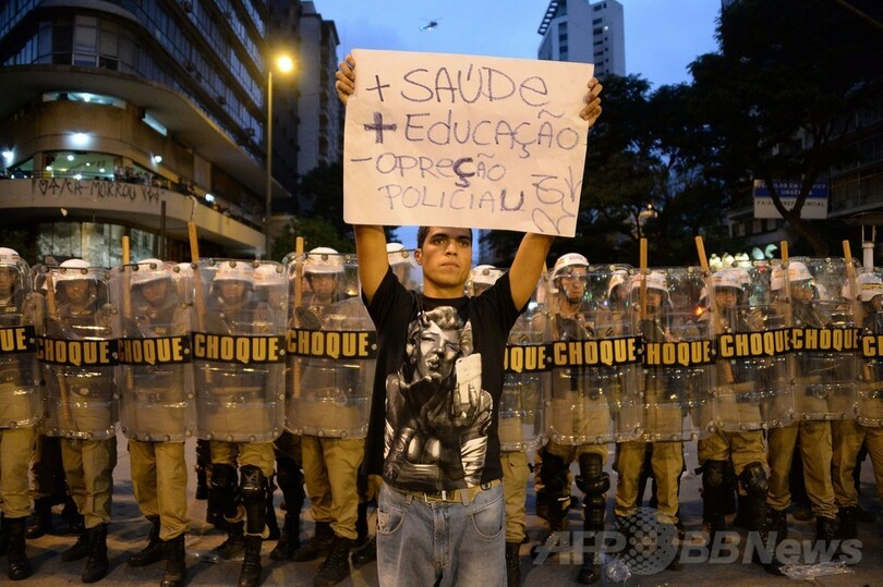 【6月13日 AFP】サッカーW杯ブラジル大会(2014 World Cup)開催12都市の1つ、ブラジル南東部ベロオリゾンテ(Belo Horizonte)で12日、W杯に巨額の予算を投じたことに抗議するデモが行われ、参加者の一部が暴徒化し店舗や銀行を襲撃して警官隊と衝突した。