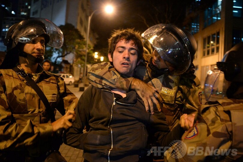 ブラジルではW杯開幕に合わせサンパウロなど各地で抗議デモが発生。同市では、開幕戦の行われるアレーナ・デ・サンパウロ(Arena de Sao Paulo)に行進するデモ隊に、機動隊が催涙ガスや威嚇用手投げ弾、ゴム弾を使用する衝突があった。(c)AFP