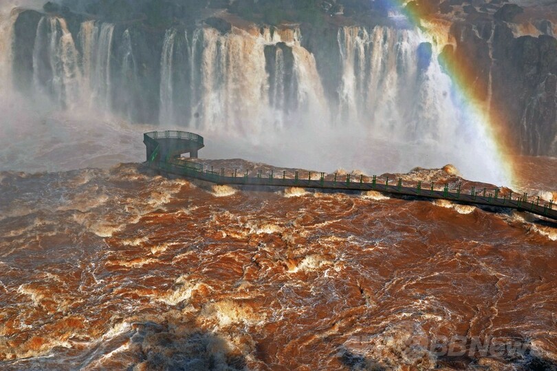 【6月13日 AFP】南米ブラジルのフォス・ド・イグアス(Foz do Iguacu)で12日、世界遺産の「イグアスの滝(Iguazu Falls)」の濁流の上にかかる虹をAFPのカメラが捉えた。イグアスの滝は、上流で降り続いた豪雨の影響で大幅に増水しており、観光用の橋が破損するなどの被害が出ている。
