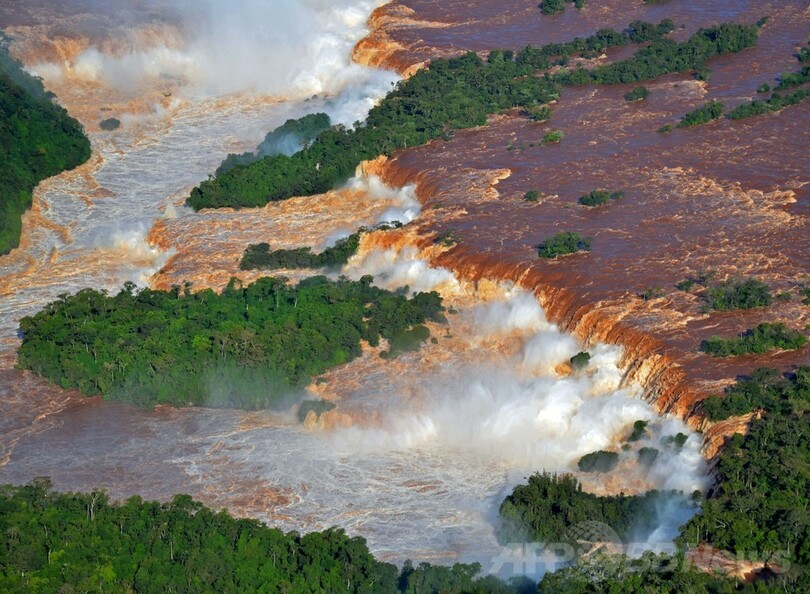 パラナ州電力公社(COPEL)によれば、9日時点でのイグアスの滝の流量は、通常の30倍を観測した。隣接するパラグアイでも洪水が発生し、地元当局によると首都アスンシオン(Asuncion)で約15万人が避難を余儀なくされているという。(c)AFP