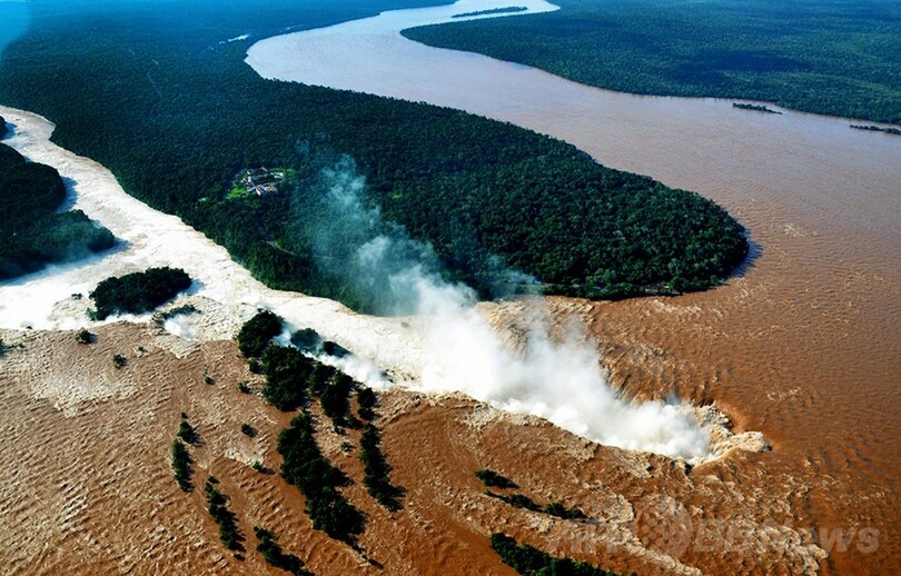 パラナ州電力公社(COPEL)によれば、9日時点でのイグアスの滝の流量は、通常の30倍を観測した。隣接するパラグアイでも洪水が発生し、地元当局によると首都アスンシオン(Asuncion)で約15万人が避難を余儀なくされているという。(c)AFP