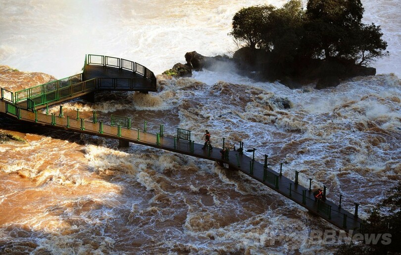 パラナ州電力公社(COPEL)によれば、9日時点でのイグアスの滝の流量は、通常の30倍を観測した。隣接するパラグアイでも洪水が発生し、地元当局によると首都アスンシオン(Asuncion)で約15万人が避難を余儀なくされているという。(c)AFP