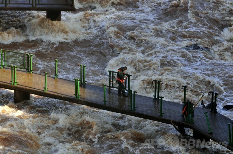 パラナ州電力公社(COPEL)によれば、9日時点でのイグアスの滝の流量は、通常の30倍を観測した。隣接するパラグアイでも洪水が発生し、地元当局によると首都アスンシオン(Asuncion)で約15万人が避難を余儀なくされているという。(c)AFP